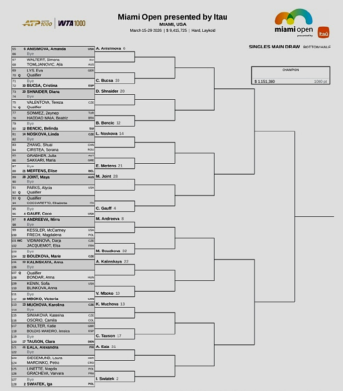 而WTA1000迈阿密站的单打签表已经出炉,前八大种子的对位:上半区,萨巴伦卡--鲍里妮、莱巴金娜--佩古拉;下半区,阿尼西莫娃--高芙、米拉-安德列娃--斯瓦泰克。上届八强、中国一姐郑钦文位列第23号种子,首轮轮空,次轮将对阵美国人布雷迪或斯蒂芬斯,第三轮的潜在对手是美国名将凯斯或刚刚赢过她的克罗地亚人鲁季奇,第四轮将对位世界第一萨巴伦卡,签表很硬,保分压力很大。