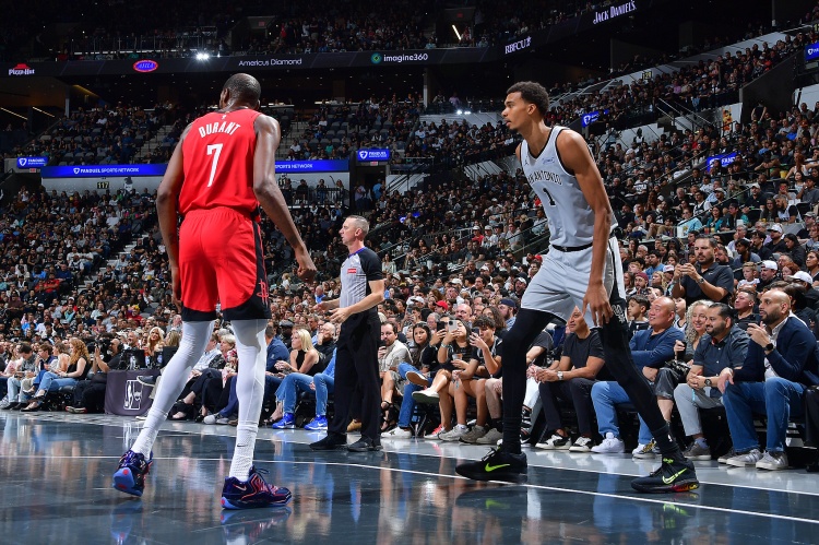 火箭进攻简单残暴,申京1对1支配了文班亚马,这组对位竟然打出了“倒反天罡”的效果,身高臂长的文班亚马不仅没压制住申京,反而被申京的力量和吨位轻松碾到了篮下,申京单节6中5独得11分;杜兰特一对一无差别单挑马刺锋卫群,首节5中4刀刀见血。