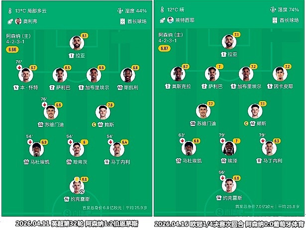 基于“客场保平争胜”的目标,阿尔特塔安排哈弗茨担任首发,德国人在下半场中段已经非常疲惫,约克雷斯出场时间有些晚了。
