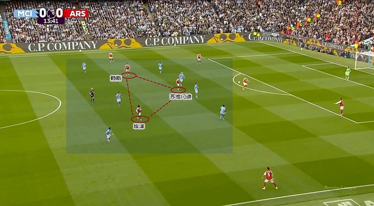 利用赖斯前压后留下的空间,曼城至少三次从中肋部切开枪手的防线,取得两粒进球。