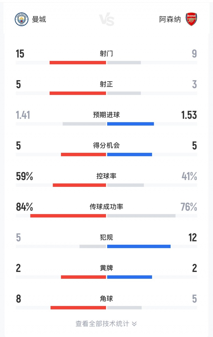 控球率保持在四成以上(41%-59%),射门次数落后的也不多(9-15),在得分机会(5-5)和预期进球数(1.53-1.41)等方面甚至占据优势……阿森纳拥有英超最佳防线,却没能依靠擅长的防反打法赢得比赛,这一方面是因为队内缺少哈兰德这样高效的得分手,机会转化率不高,另一方面是阿尔特塔的临场指挥和建队思路都很保守,导致阿森纳在战略博弈方面落于下风。